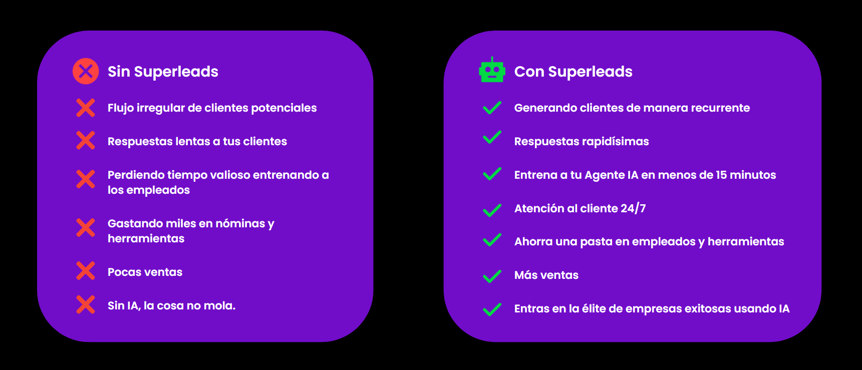 ¡Dile adiós a los anuncios costosos y poco efectivos! Con Superleads, desata el poder de la IA para crear campañas que no solo son un 90% más económicas y aumentan tus clics en más de un 105% por encima del promedio, sino que también te ahorran tiempo, permitiéndote lanzar anuncios rápidamente y ver resultados casi al instante, generando más clientes potenciales para tu negocio en un abrir y cerrar de ojos.